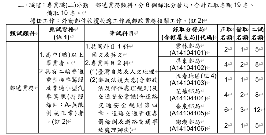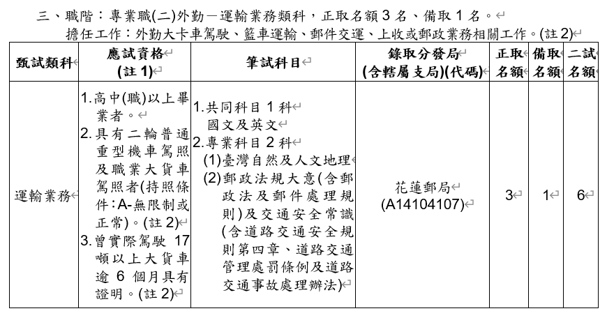 (二).【(郵局)招考】:【(高中職畢)(初階人員)】→【專業職(二)】~【外勤郵遞】→「郵遞業務、運輸業務」:
