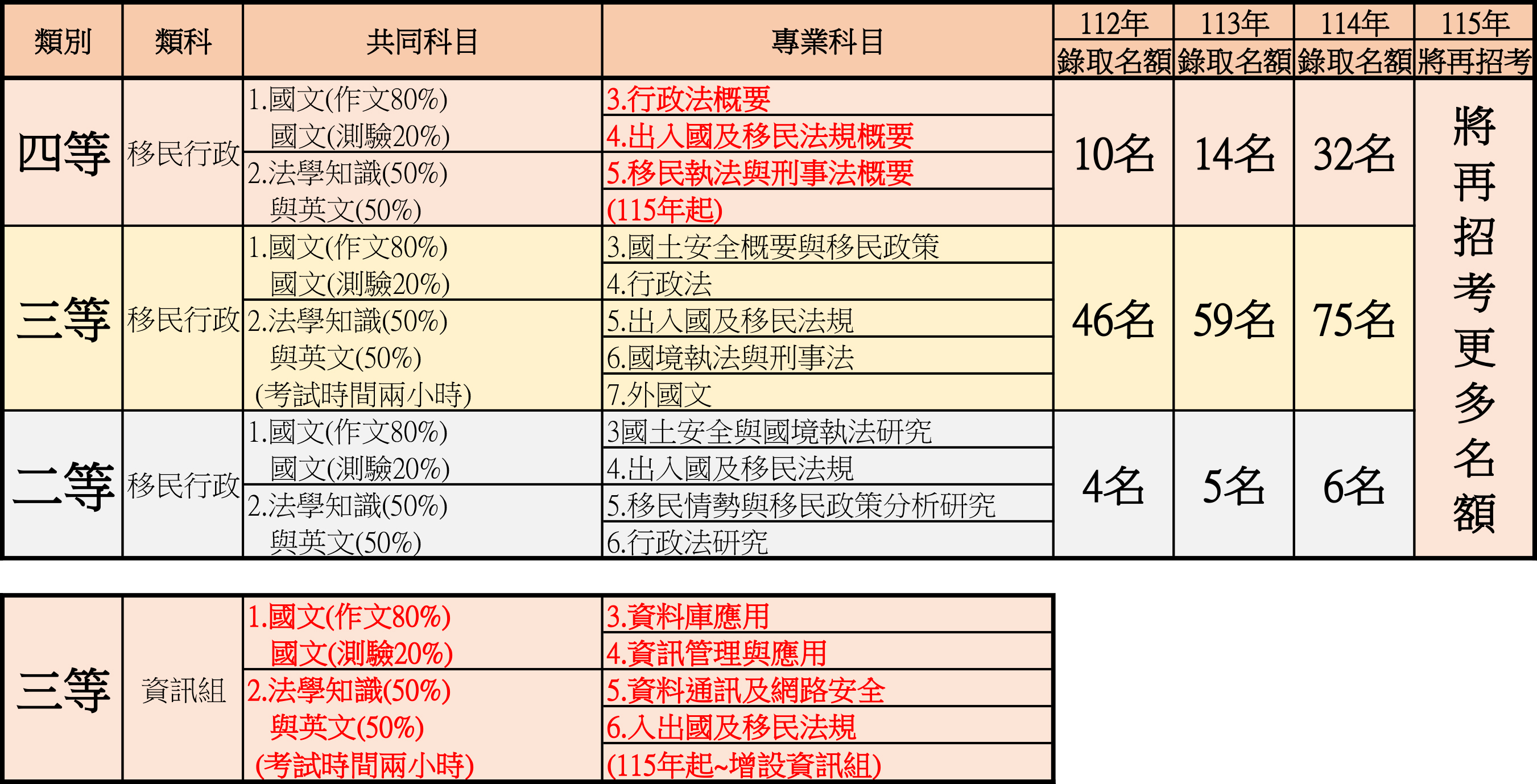 依據《公務人員考試法》第七條第一項規定,配合內政部就移民行政業務龐雜特殊的性質,針對實際勤務與科技犯罪趨勢進行人力調整,主要變更重點如下: