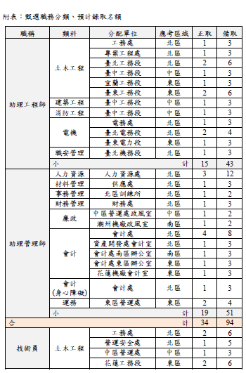 第 8 階助理管理師:正取 4 名、備取 12 名,月薪約 45,130 元(支 35 級 270 薪點)。