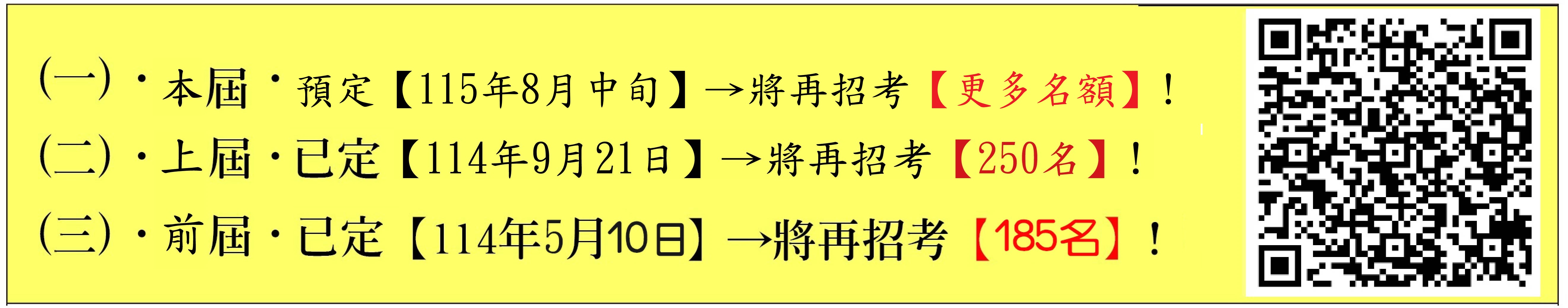 已定【114年(9月21日)】→將再招考【250名以上】(正取: 184名,備取:66名)!